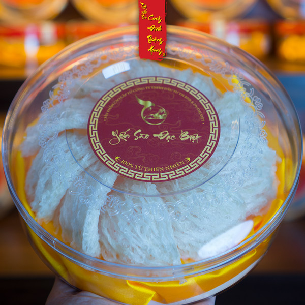 Tổ yến đã được xử lý sạch, sợi phồng, ngả vàng, trắng, có độ bóng ánh kim.