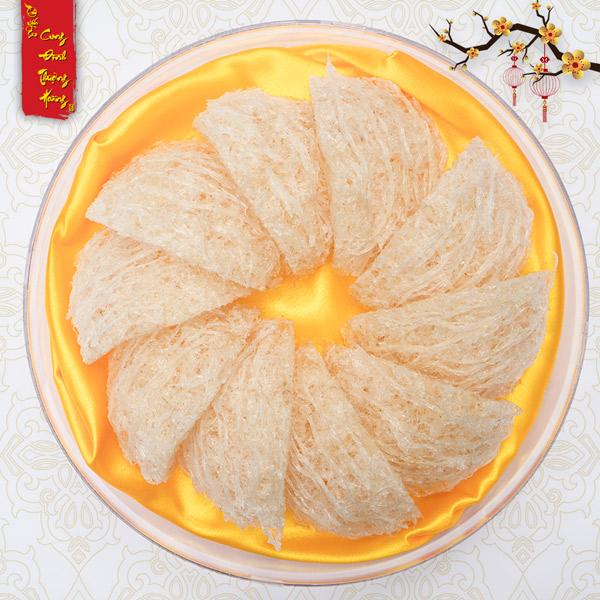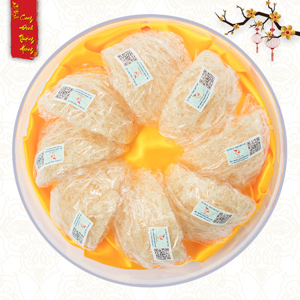 Tổ yến thô đã được xử lý sạch, sợi phồng, ngả vàng, có độ bóng ánh kim.